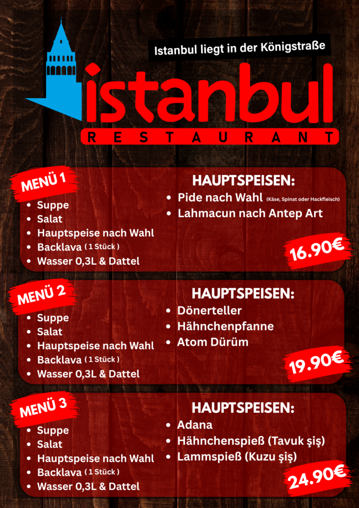 Von traditionellen Vorspeisen über herzhafte Hauptgerichte bis hin zu süßen Köstlichkeiten – jedes Menü ist eine kleine Reise durch die türkische Küche. Frisch zubereitet, mit hochwertigen Zutaten und viel Liebe serviert.