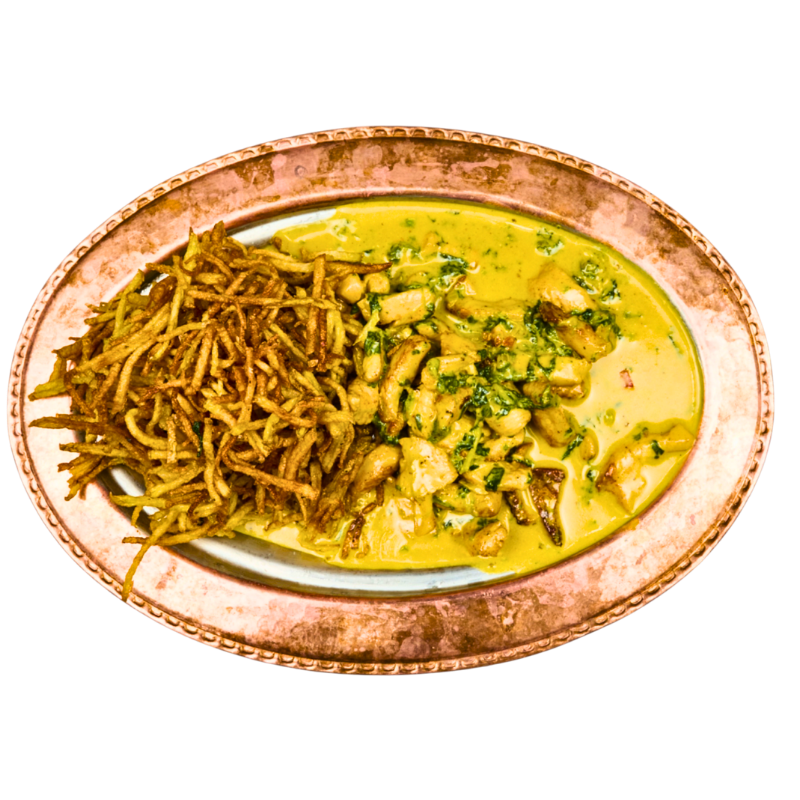 Saftige Hähnchenbrust in samtiger Champignon-Rahmsoße, harmonisch ergänzt durch frische Paprika. Goldene Kartoffelsticks krönen das Gericht mit feiner Knusprigkeit.